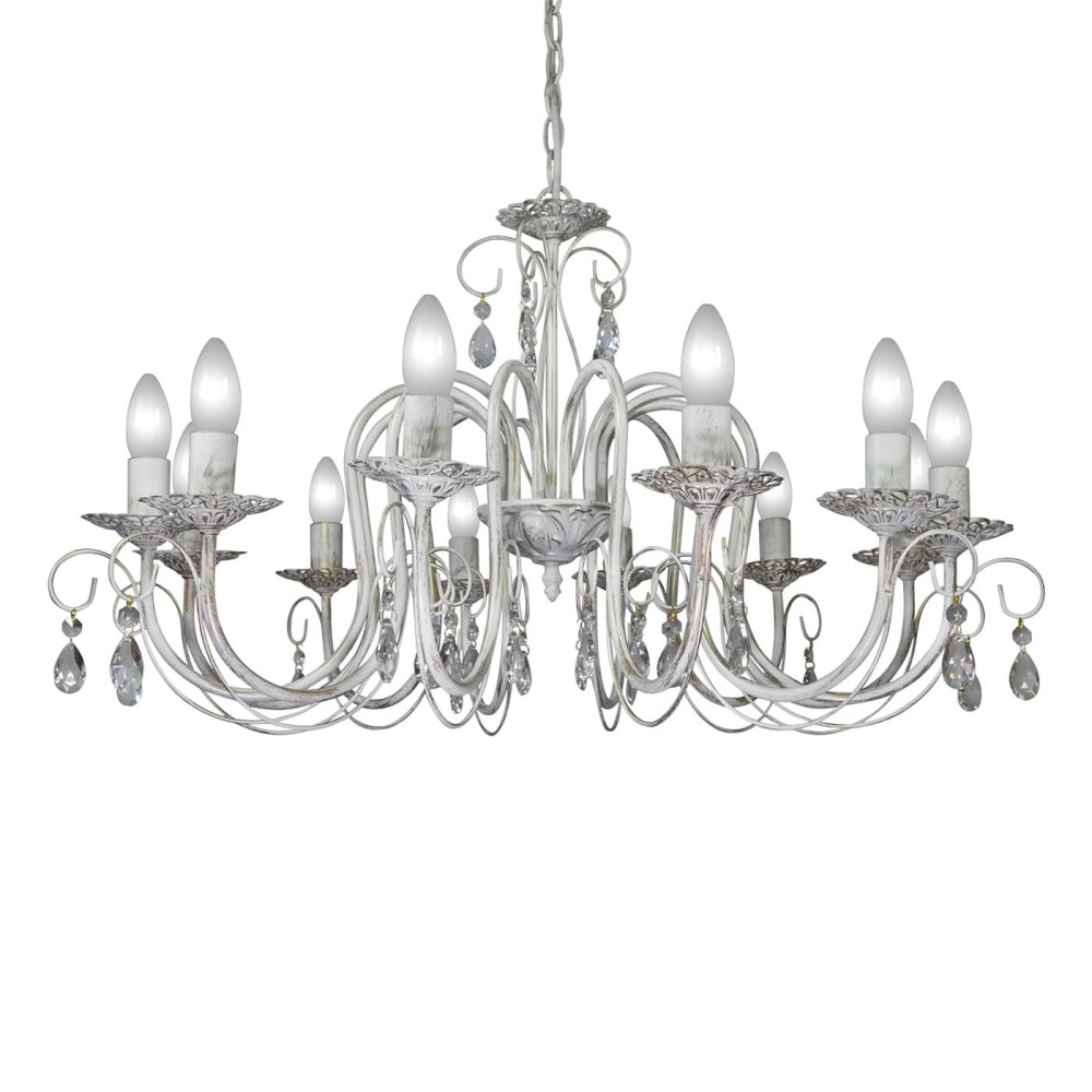 Люстра подвесная большая ковка свечи хрусталь 12 ламп российского производства ПЕТРАСВЕТ S1147-12, 12хЕ14 макс, 60Вт с хрустальными подвесками, цепь можно укоротить до 1 звена на 17 см, стиль - классика свечи, арматура - металл, цвет светильника- белый с патиной золота, размеры светильника (LxWxH) - 73x73x71, вес - 4 кг,