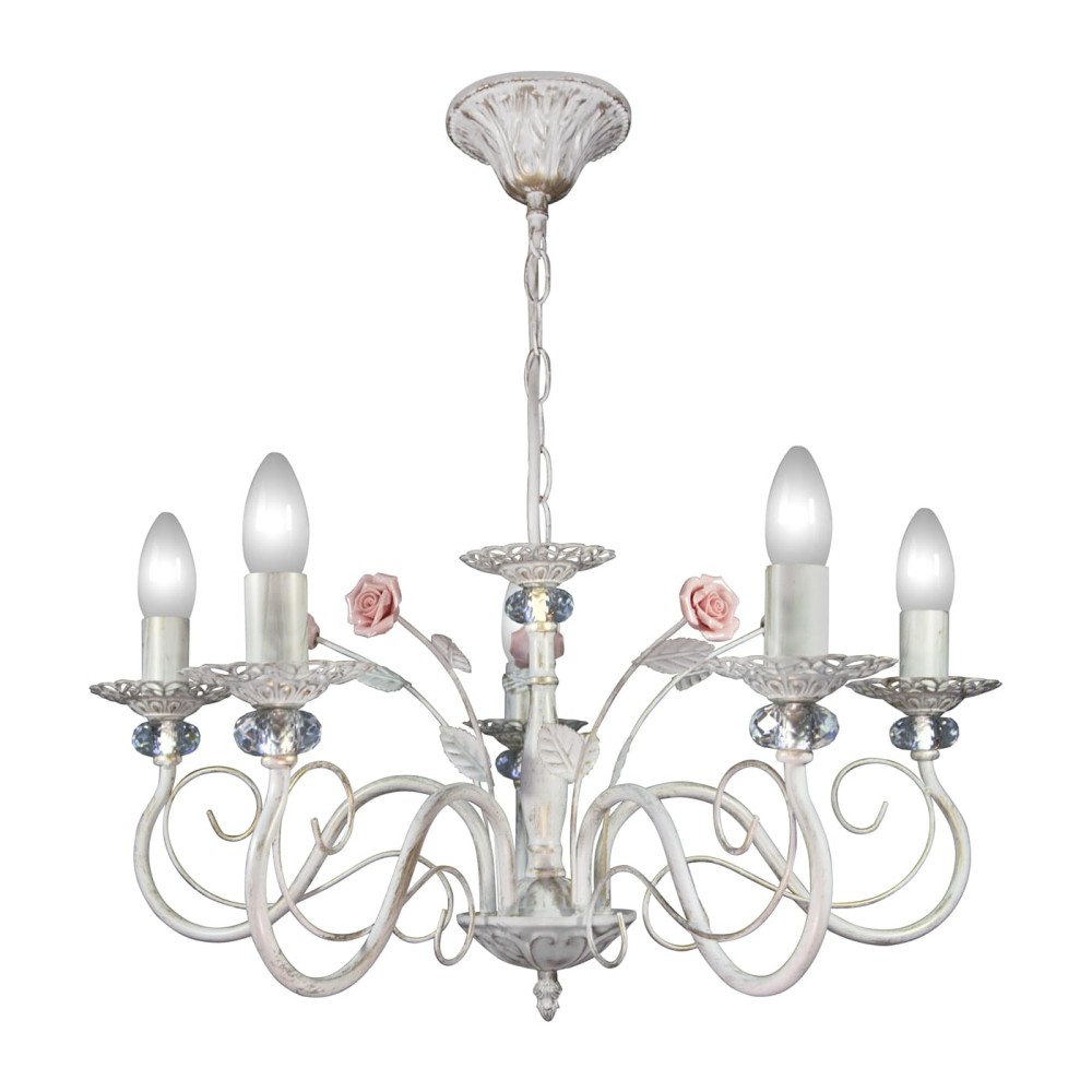 Люстра подвесная флористика с листочками и розами розовыми 5 ламп российского производства ПЕТРАСВЕТ S1230-5, 5хЕ14 макс, 60Вт, цепь можно укоротить до 1 звена на 17 см, стиль - классика свечи, арматура - металл, цвет светильника- белый с патиной золота, размеры светильника (LxWxH) - 62x62x62, вес - 1,6 кг.