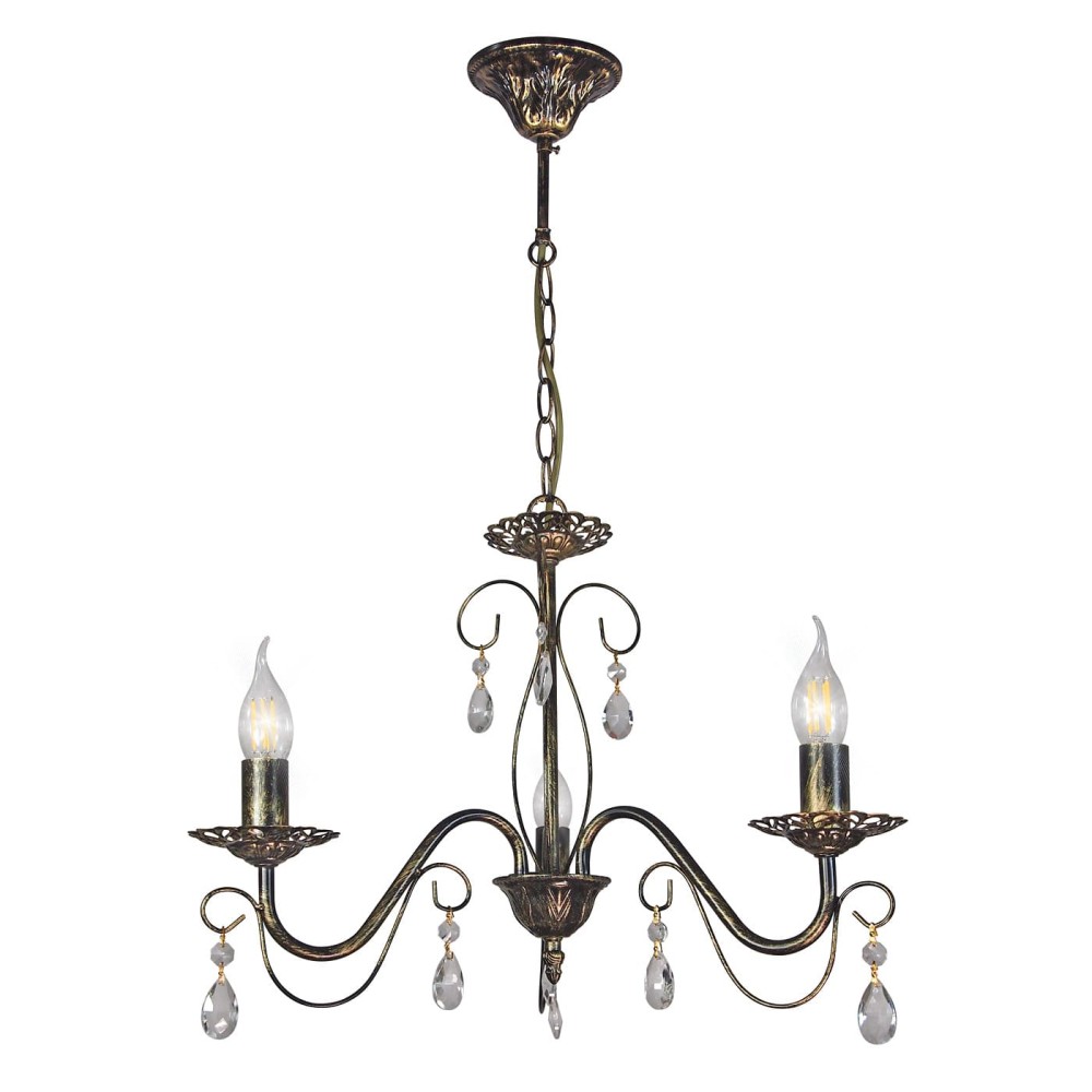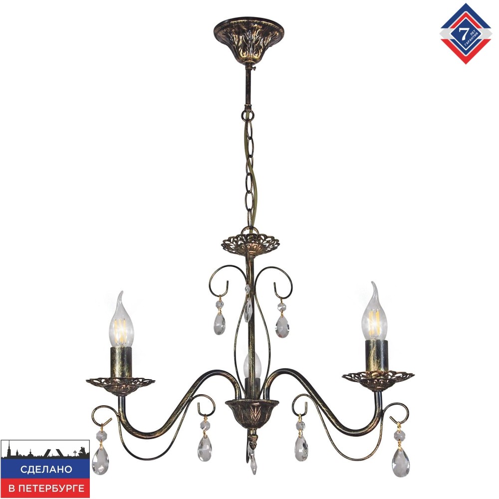 Люстра подвесная 3 лампы цепная свечи 3 Аврора российского производства ПЕТРАСВЕТ S1154-3 с хрустальными подвесками, цепь можно укоротить до 1 звена на 17 см, стиль - классика свечи, арматура - металл, цвет светильника- черный с патиной золота, размеры светильника (LxWxH) - 52x52x68, вес - 1,5 кг.