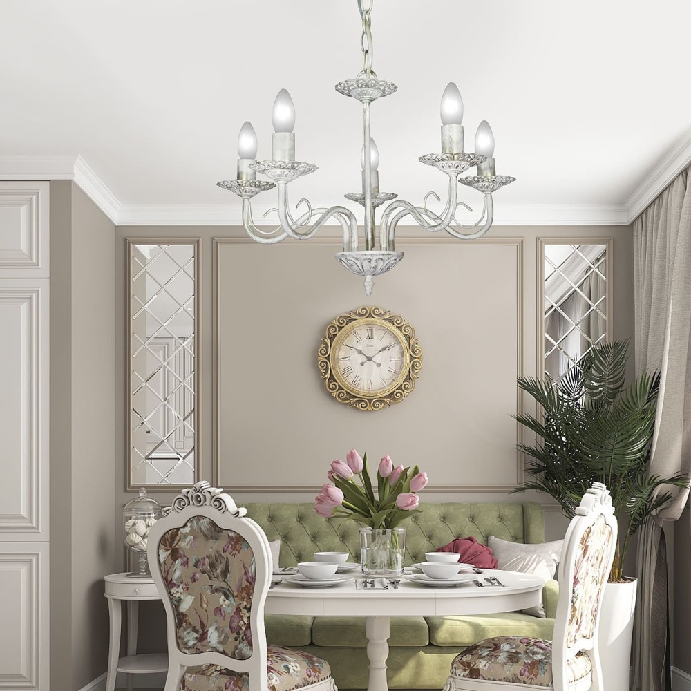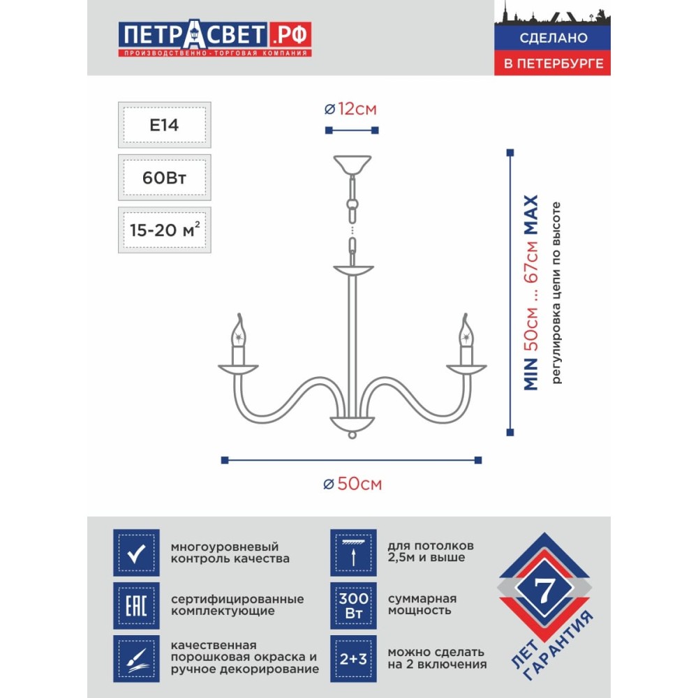 Люстра подвесная 5 ламп S1167-5 – элегантное освещение для вашего дома от Петрасвет Эта роскошная подвесная люстра S1167-5 от бренда Петрасвет – идеальное решение для создания атмосферы уюта и изысканности в любом интерьере. Она сочетает в себе классическую элегантность, современный дизайн и высокое качество исполнения, что делает ее настоящим украшением вашего дома. Люстра станет центром внимания в гостиной, спальне, прихожей или столовой, преображая пространство и создавая неповторимую атмосферу. Преимущества и характеристики: Люстра S1167-5 – это не просто источник света, это инвестиция в стиль и комфорт. Она выполнена из прочного и долговечного металла, покрытого патиной золота, что придает ей благородный и винтажный вид. Сочетание классического дизайна и современного исполнения делает эту люстру универсальной и подходящей для различных стилей интерьера – от неоклассики и прованса до современного минимализма. Классический стиль и неоклассика: Люстра идеально вписывается в стили неоклассики и прованса, добавляя нотку роскоши и элегантности. Ее пропорции и деталировка подчеркивают красоту и изысканность, создавая атмосферу уюта и гостеприимства. Высокое качество материалов: Люстра изготовлена из металла, что гарантирует ее долговечность и устойчивость к внешним воздействиям. Покрытие патиной золота придает ей особый шарм и создает эффект состаренного металла, добавляя нотку винтажности. Универсальность: Благодаря своему стилю и дизайну, люстра подходит для различных помещений, включая гостиные, спальни, столовые, холлы и прихожие. Надежность и долговечность: Произведена в России, что гарантирует соответствие высоким стандартам качества. Люстра оснащена надежным креплением – крюком, обеспечивающим безопасную установку. Гарантия качества: Производитель предоставляет гарантию 7 лет, что является подтверждением высокого качества продукции и уверенности в ее надежности. Технические характеристики: Бренд: Петрасвет Модель: S1054 Тип: Подвесная люстра Количество ламп: 5 Тип цоколя: E14 Напряжение: 220 В Материал светильника: Металл Цвет светильника: Белый с патиной золота Стиль: Классический, неоклассика, прованс Площадь освещения: 15-20 м? Световой поток: 3750 лм Размеры (в упаковке): 20 см (В) x 37 см (Д) x 27 см (Ш) Размеры светильника: Ширина основания: 12 см, Высота: 50-67 см Направление рассеивателя: Вверх Тип крепления: Крюк Вид ламп: Накаливания, светодиодная, люминисцентная Комплектация: Светильник, паспорт Возможности и варианты использования: Гостиная: Люстра S1167-5 станет прекрасным акцентом в гостиной, создавая атмосферу уюта и комфорта. Она идеально подойдет для создания расслабляющей обстановки для семейных вечеров или для приема гостей. Спальня: Мягкий и рассеянный свет, создаваемый этой люстрой, идеально подходит для создания романтической и расслабляющей атмосферы в спальне. Столовая: Люстра подчеркнет элегантность столовой и создаст приятную атмосферу для семейных обедов и ужинов. Прихожая: Подвесная люстра в прихожей обеспечит достаточное освещение и создаст ощущение уюта и гостеприимства. Другие помещения: Люстру можно использовать в других помещениях, таких как кабинет, детская или балкон. Почему стоит выбрать люстру S1167-5 от Петрасвет? Сочетание стиля и функциональности: Эта люстра сочетает в себе классический диза