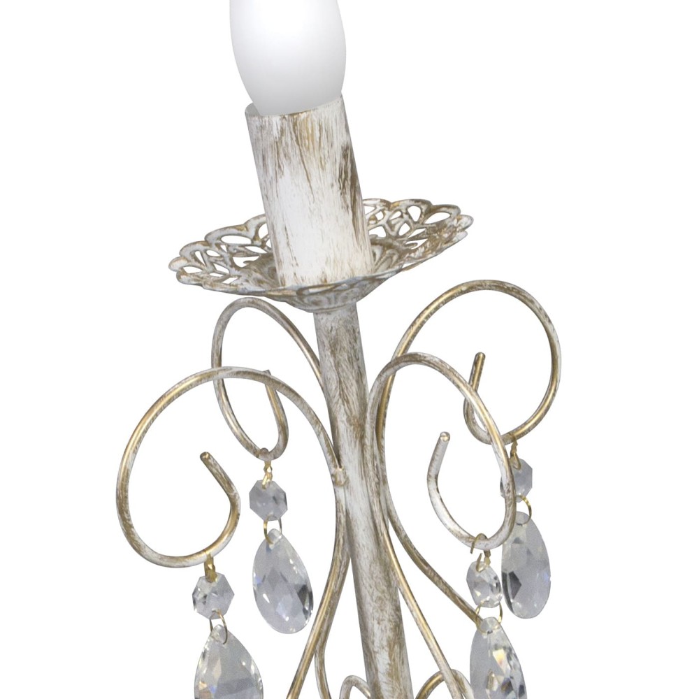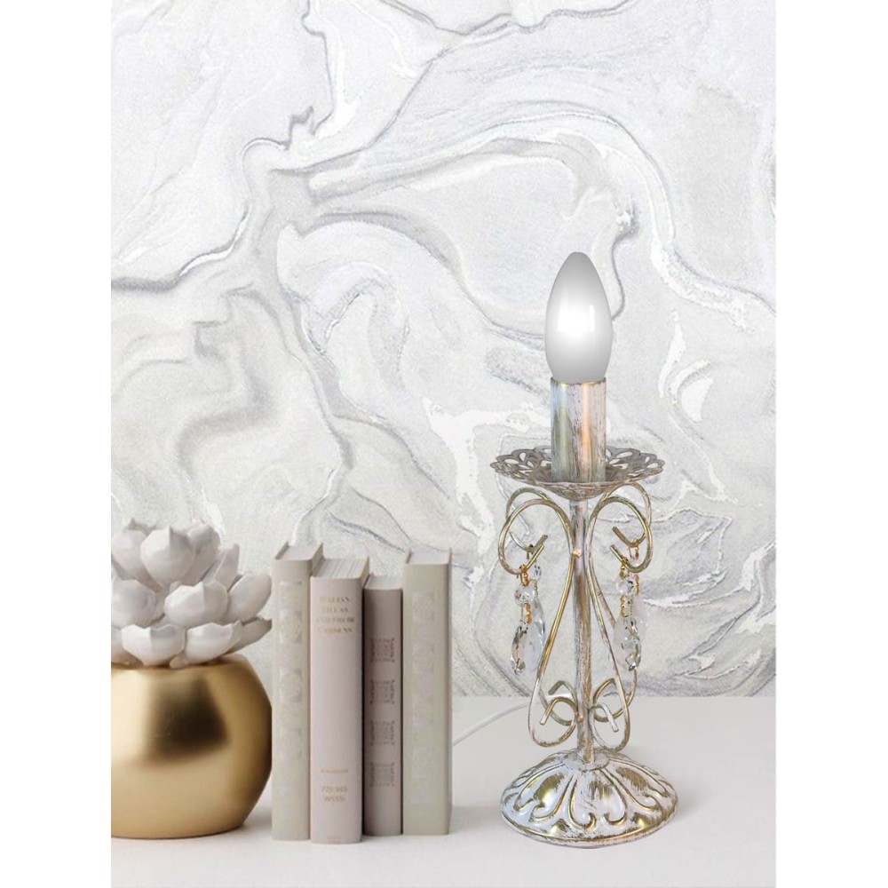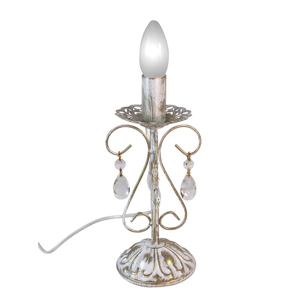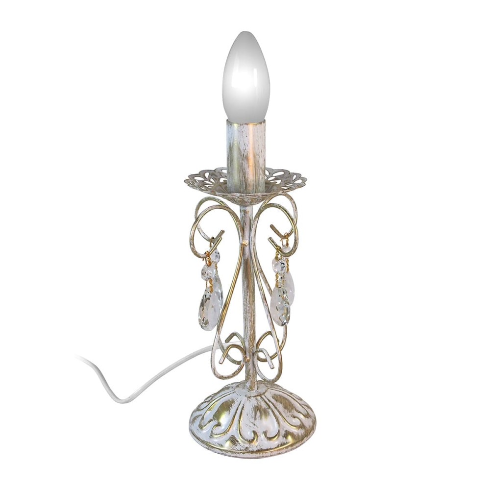 Настольная лампа с хрустальными подвесками классическая Е14 российского производства ПЕТРАСВЕТ S5084-1, 1хЕ14 макс, 60Вт с хрустальными подвесками, стиль - классический, арматура - металл, цвет светильника- белый с патиной золота, размеры светильника (LxWxH) - 14x14x27 без лампочки, вес - 0,5 кг,